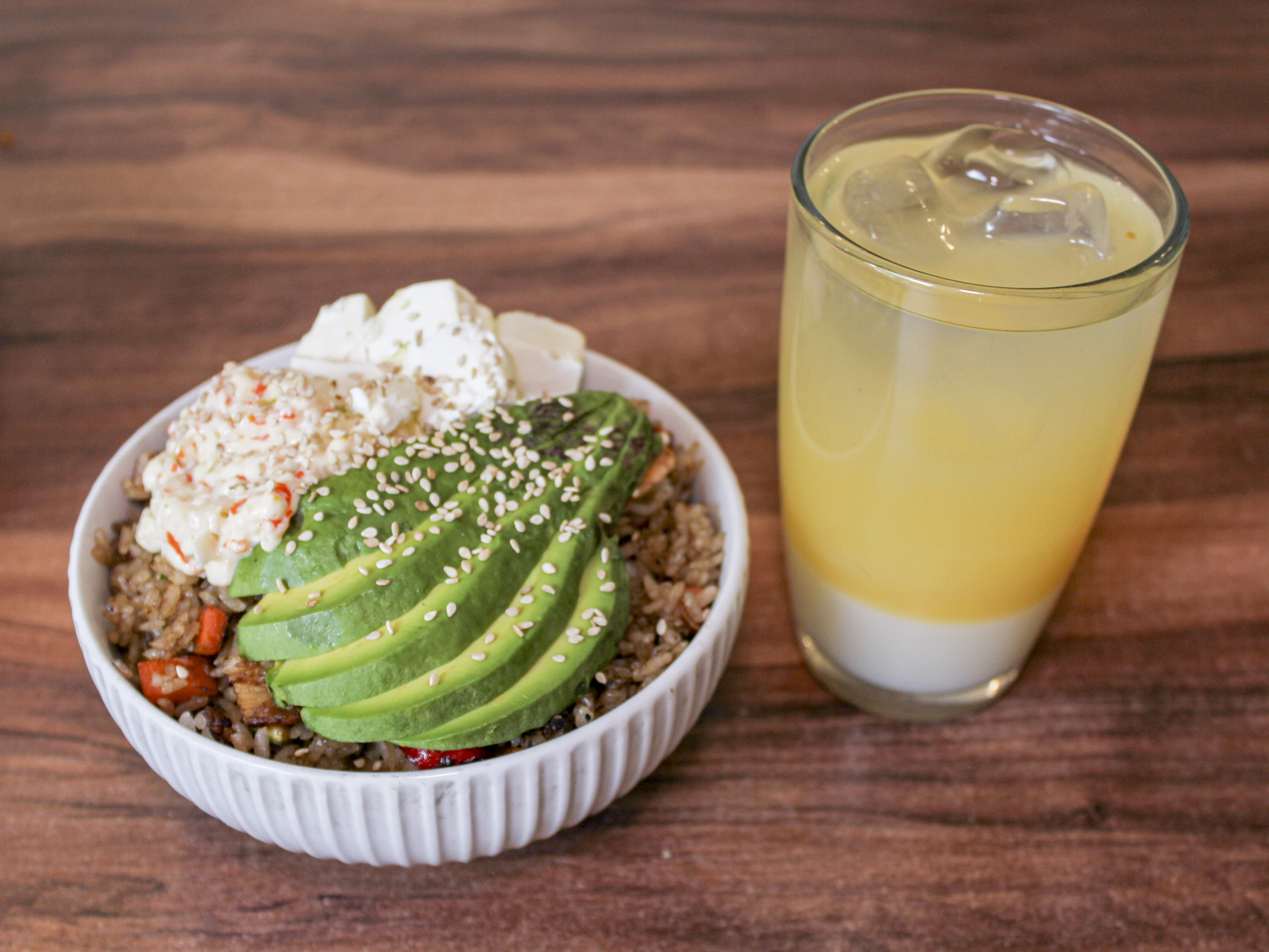 Delicioso arroz frito con calabaza y zanahoria, bolitas de queso crema empanizadas, aguacate, tampico, camarón, pollo, arrachera, negi picado y ajonjolí.