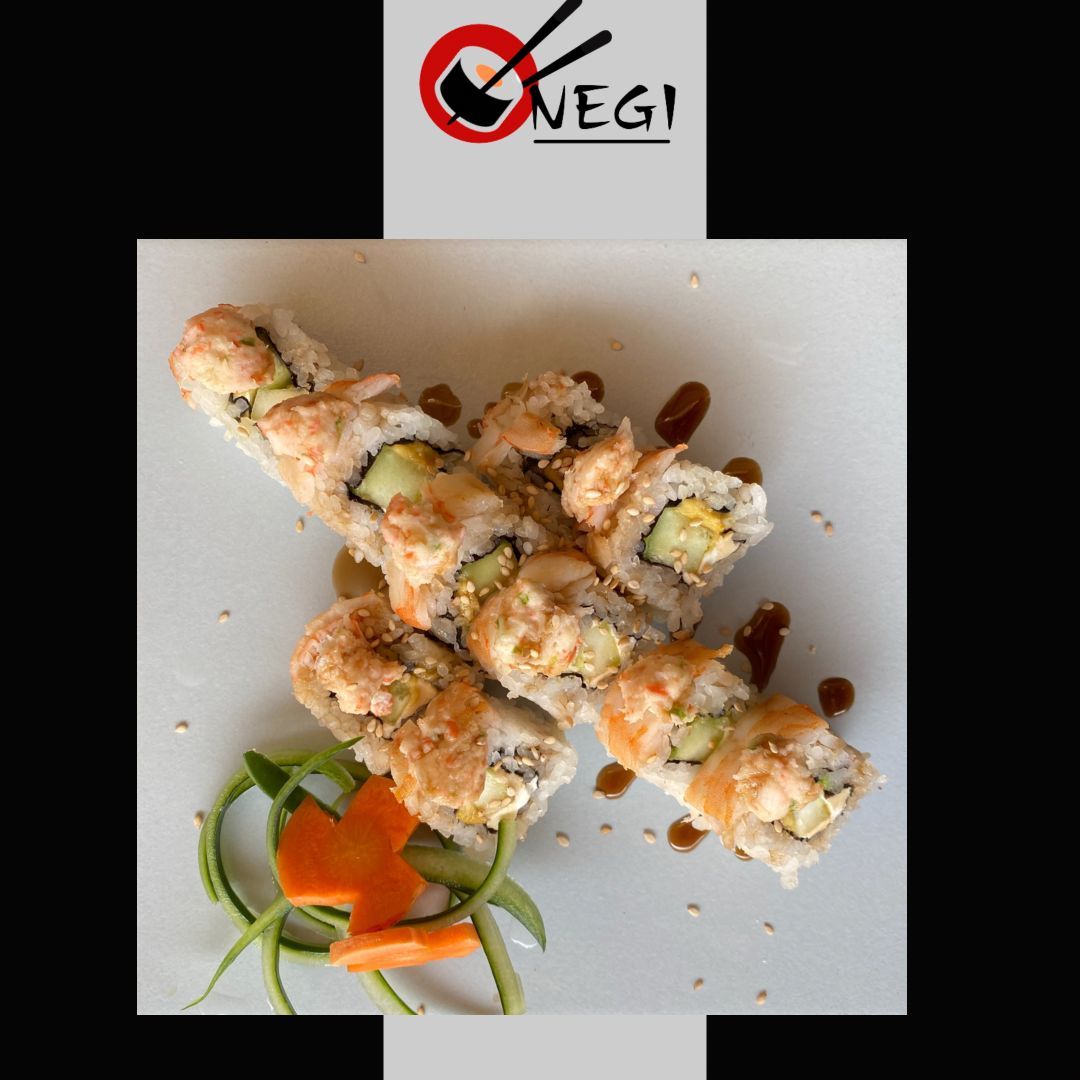 Rollo envuelto en ajonjolí, relleno de queso crema, pepino y aguacate, por fuera pollo crujiente en salsa de naranja, cebolla frita, salsa chipotle y negi picado.