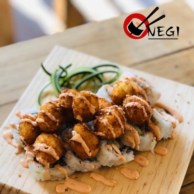 (Rollo empanizado envuelto en cangrejo, relleno de alga, queso crema, pepino, aguacate y camarón, aderezado con Tampico picante, salsa teriyaki, negi y ajonjolí)