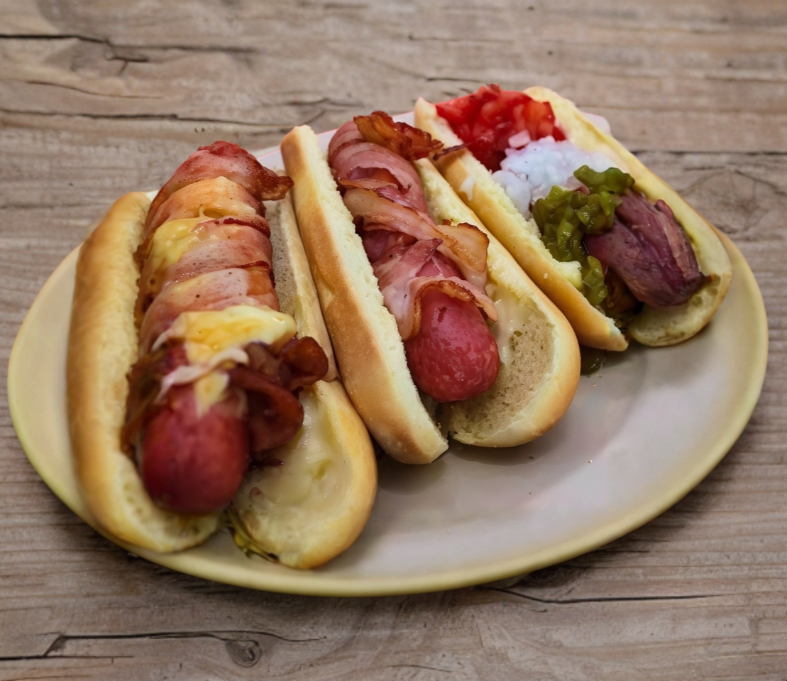 Salchicha, tocino, verduras y aderezos