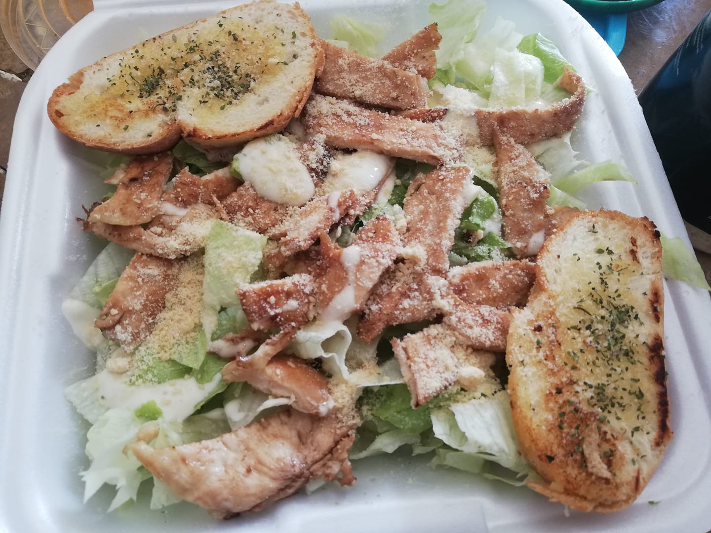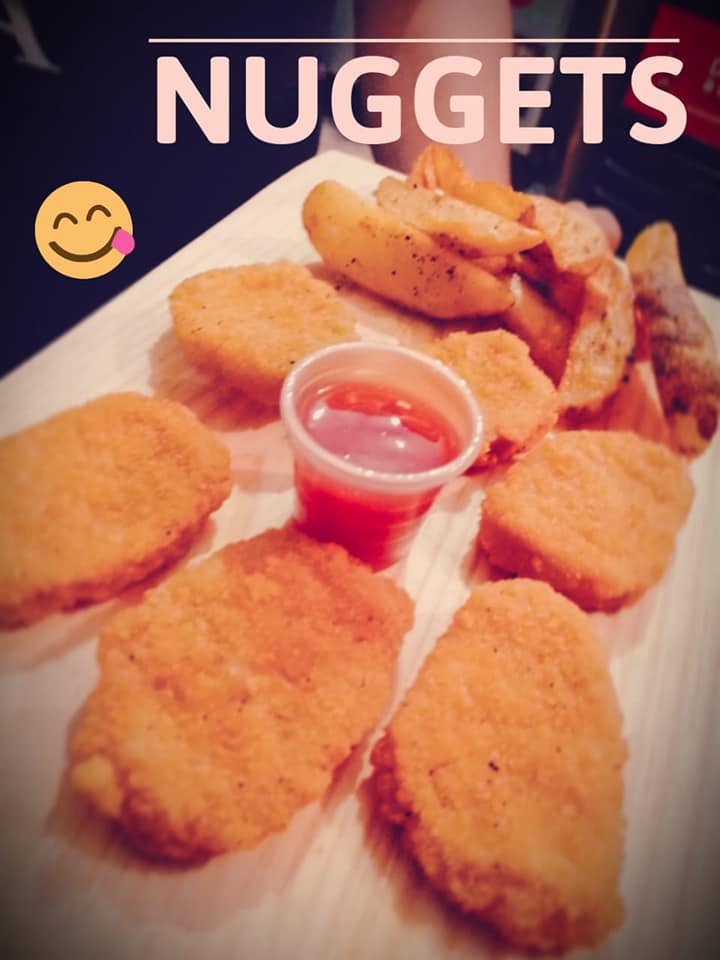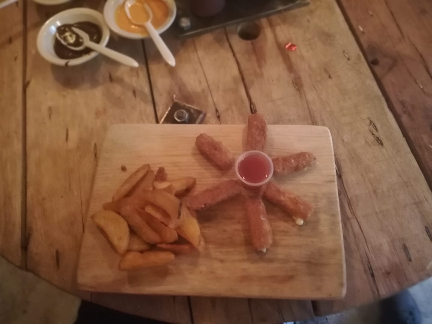 Verdura, tocino, camarón, queso blanco y papas gajo