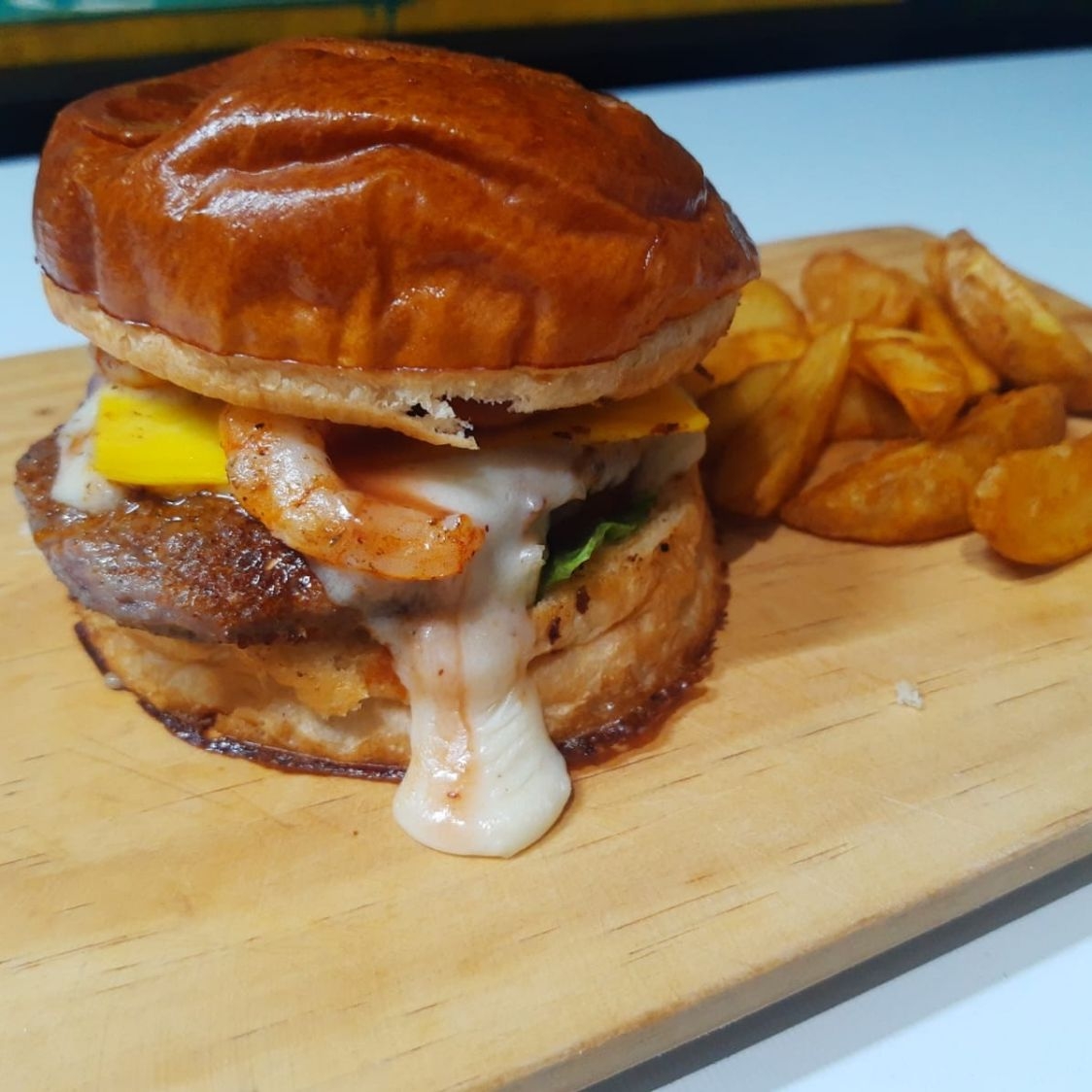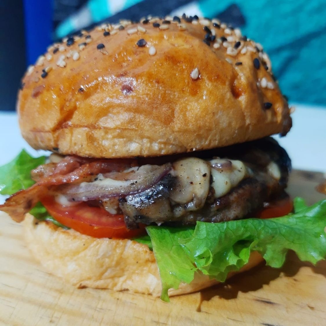 Carne de res, tocino, champiñones, queso asadero, cebolla caramelizada, y papas gajo