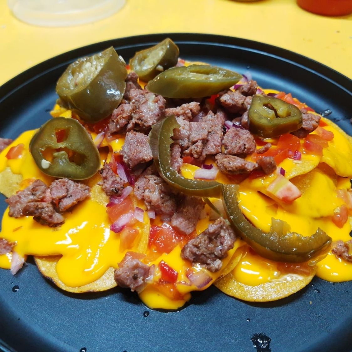 Nachos, queso, rrachera, jitomate, cebolla y chiles jalapeños