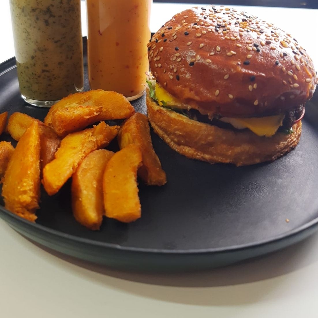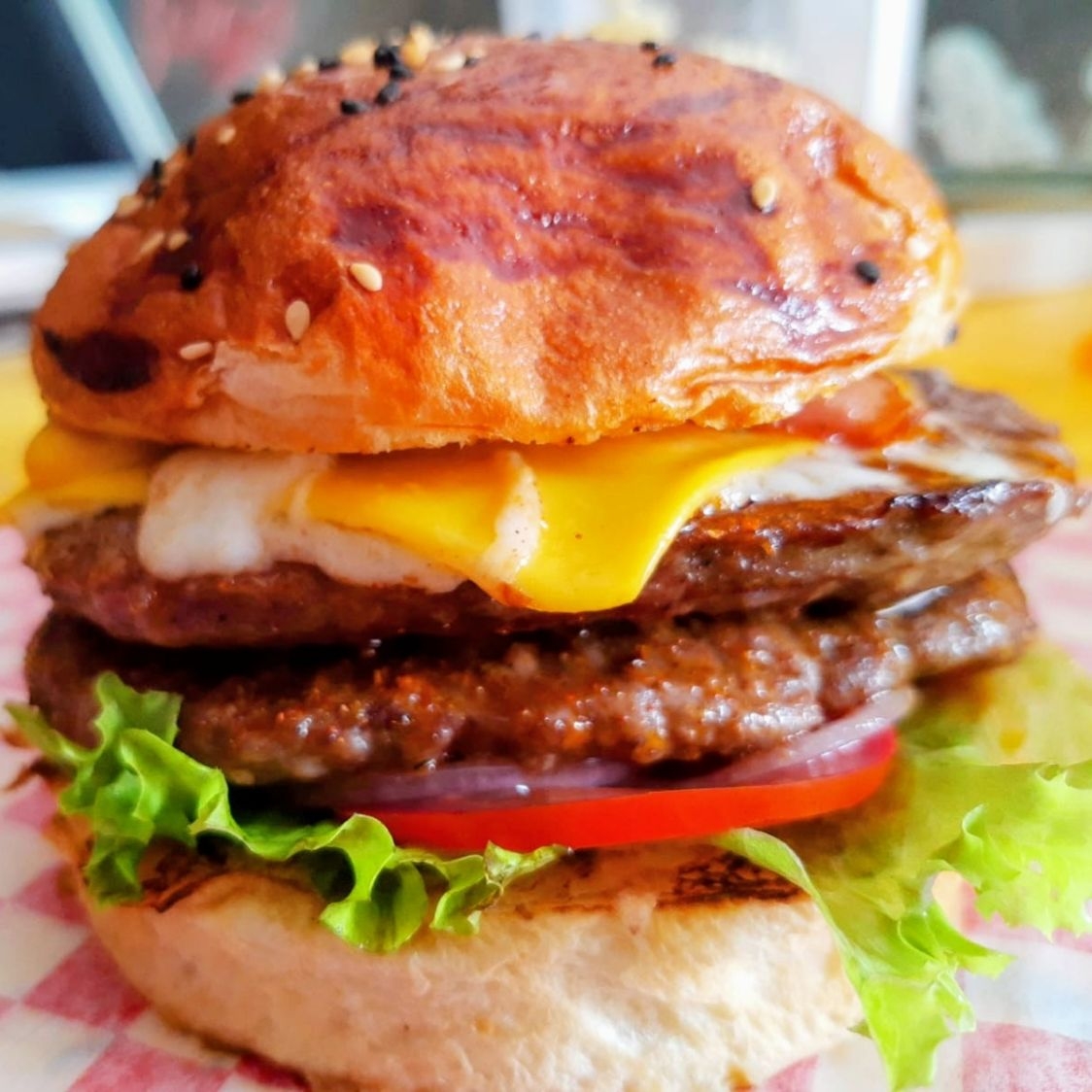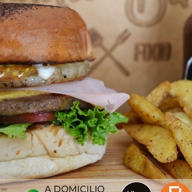 Hamburguesa doble carne , luchga , jitomate , cebolla y papas gajo