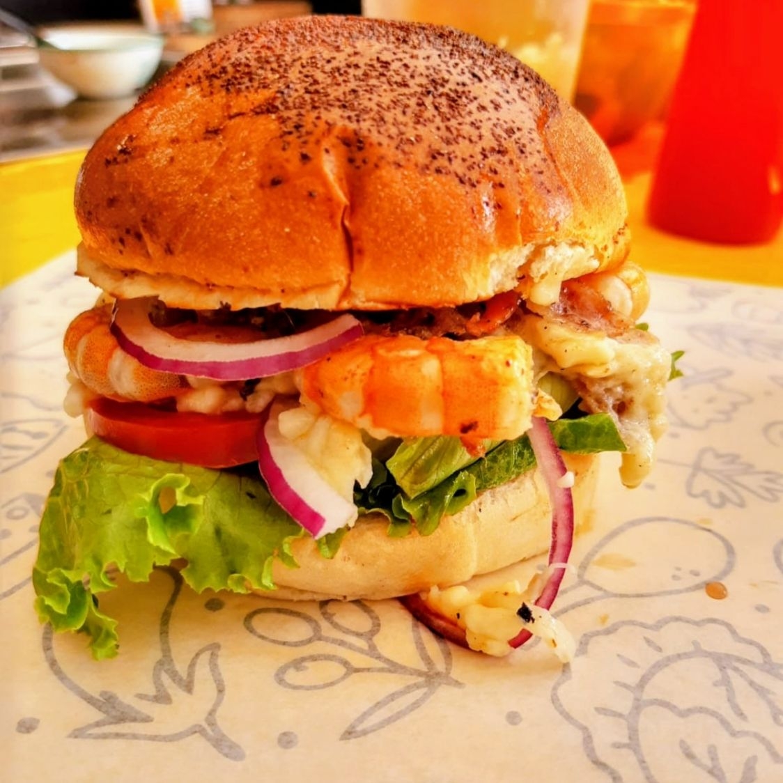 Carne de res, camarones, tocino, queso asadero, queso amarillo, verdura y papas gajo