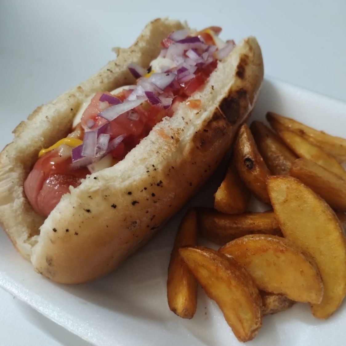 Salchicha rellena de queso asadero, enuvelto en tocino, con papas