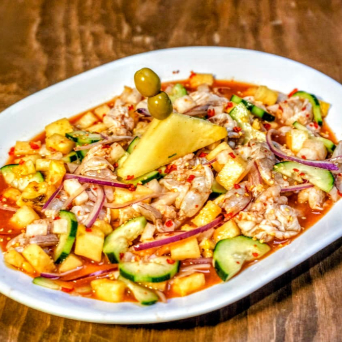 Coctel de mariscos fresco, trozoz de mango natural, cebolla morada, pepino, concentrado de tamarindo, chiltepin, sal limon, asi como pimienmta negra.
