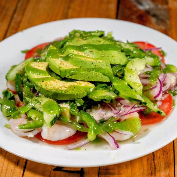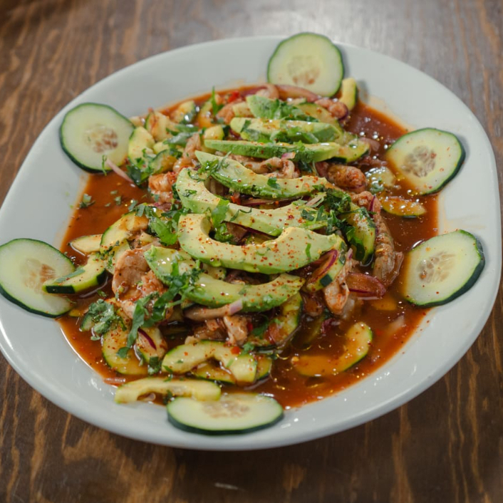 Camaron crudo 200 gr , chiltepin, salsas negras, clamato, cebolla morada, pepino y aguacate.
