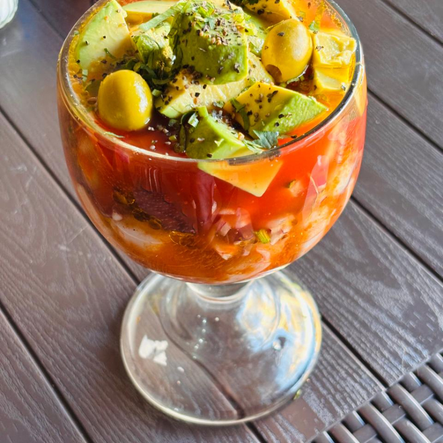 Coctel fresco, toque de picante, con clamato fresco, proteina a elejir, cebolla morada, pepino, aguacate.