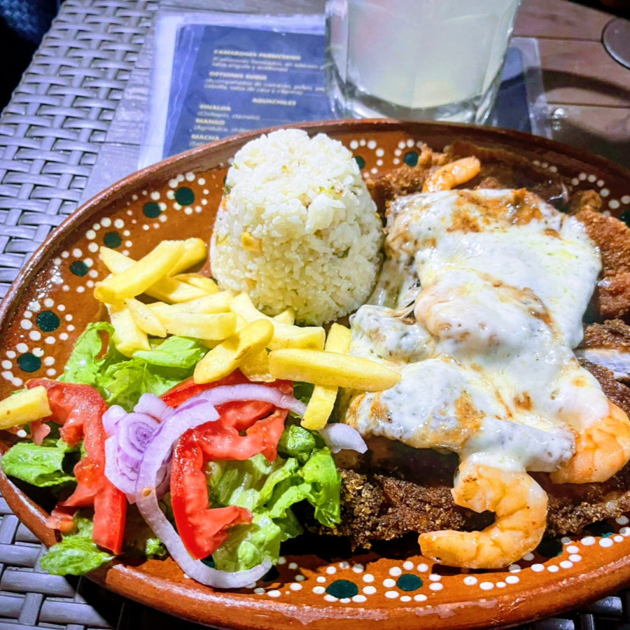 Delicioso filete de cazon empanizado con una capa de queso derretido ademas de camaron y pulpo sobre el filete, acompañado de arroz , papas, ensalada.