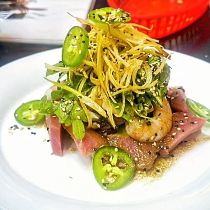 Camaron, atun, arugula, poro frito, ajonjoli y vinagreta de olivo.