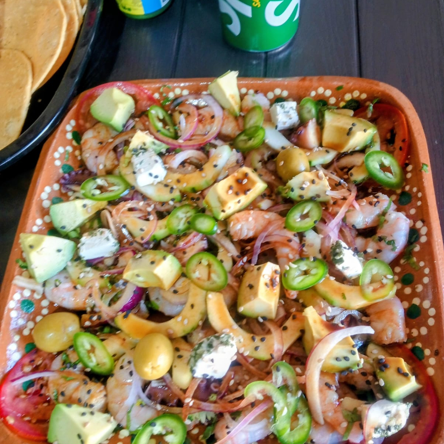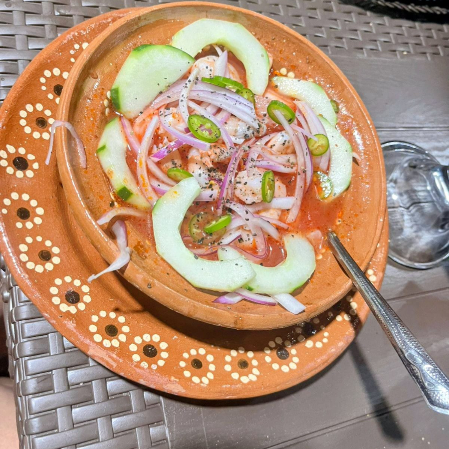 Camaron, tilapia, salseado de serrano, salsa macha, pepino, sal, cebolla , es picante