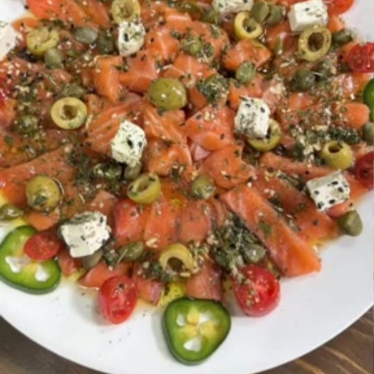 Laminas de salmon fresco, cherrys, aceitunas, alcaparras, queso philadelfia, vinagreta de aceite de olivo y finas hierbas.