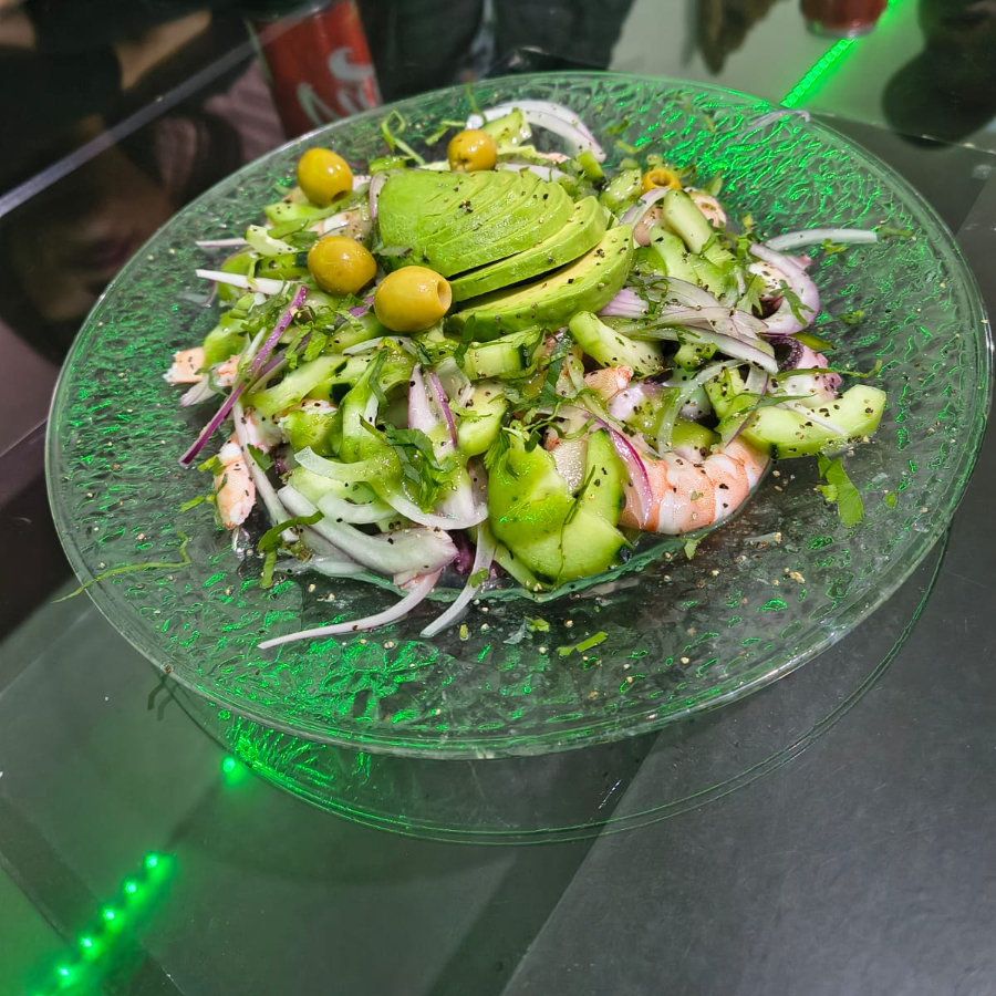 Coctel fresco, proteina a elejir, jitomate, cebolla, pepino, sal, limon , olivo, aguacate, salsas negras.