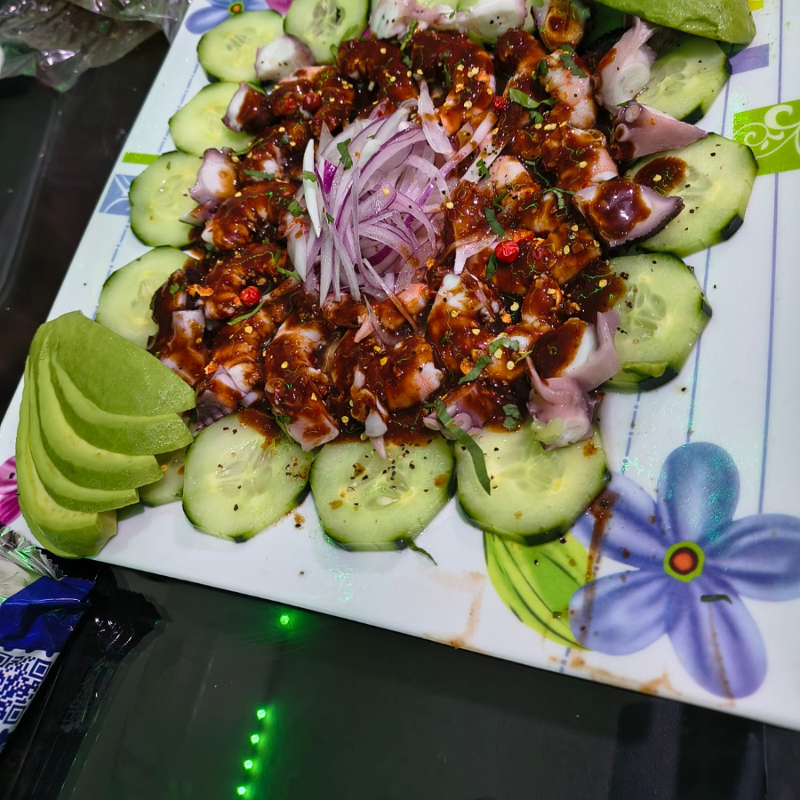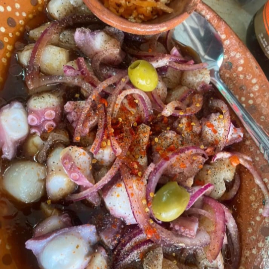 Camaron, pulpo, callo de hacha, salsas negras, chiltepin, peino, c ebolla ,orada.