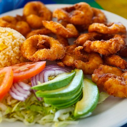 9 pzs de camaron empanizado en coco, a compañados de arroz, ensalada, papas y aderezos de la casa.