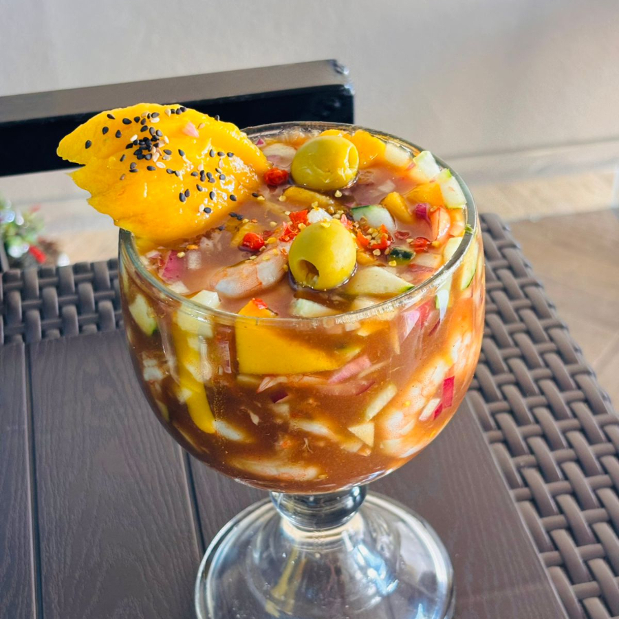 Camaron crudo 200 gr, trozos de mango natural, pepino, cebolla, jicama, salsa casera roja, limon, sal , toque de chiltepin.
