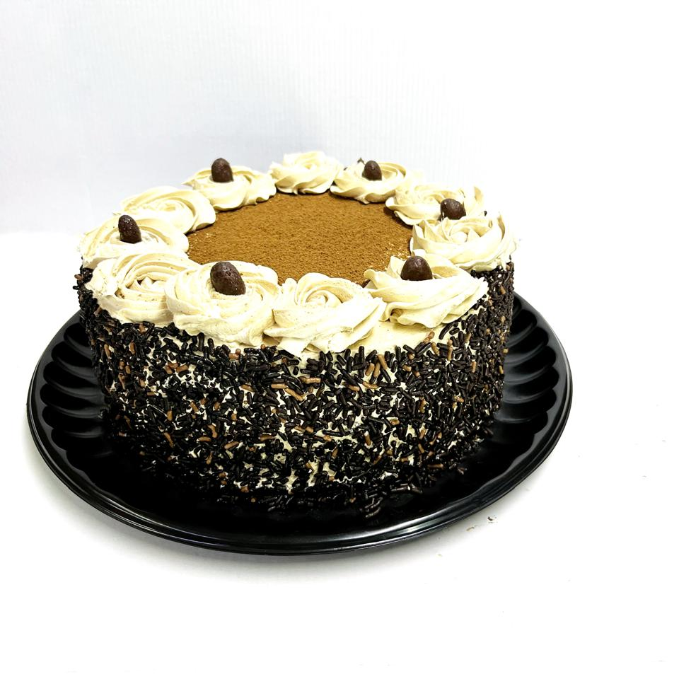 Pan esponjoso de vainilla y chocolate, con un toque ligero de licor de café, relleno de nuez, cubierto con crema especial sabor café.