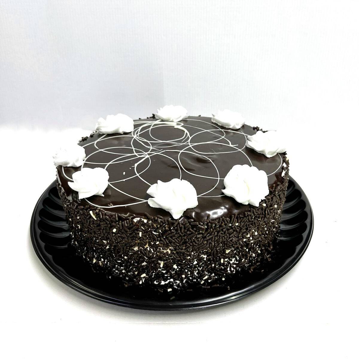 3 Capas de pan esponjoso de chocolate ligeramente húmedas, decoradas con ganache y chispas de chocolate.