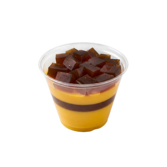 Exquisita y fresca gelatina individual de mango natural a base de leche con una franja y cubitos del delicioso sabor de Pelón Pelo Rico.