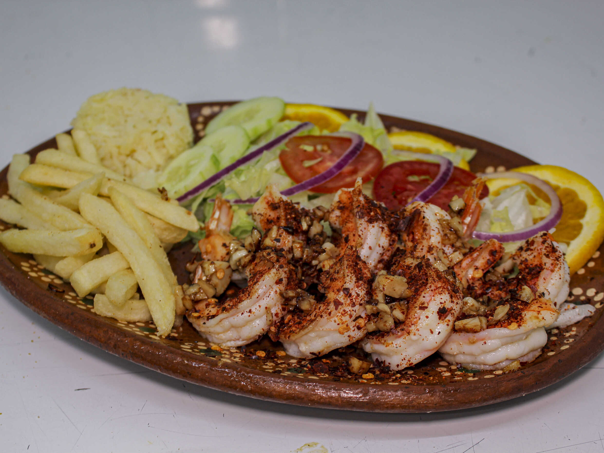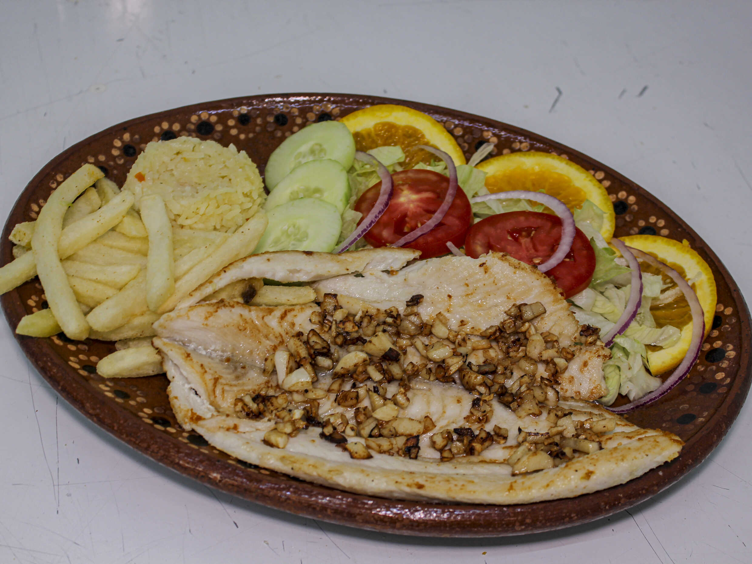 A la plancha con trozos de ajo y chile guajillo dorado. Acompañado de arroz blanco, papas a la francesa y ensalada.