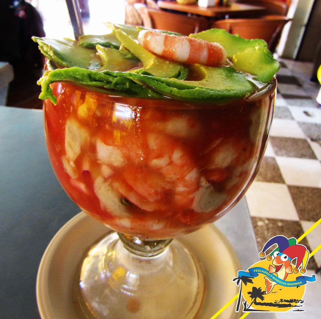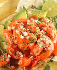 Camarón, jitomate, cebolla, aguacate.
