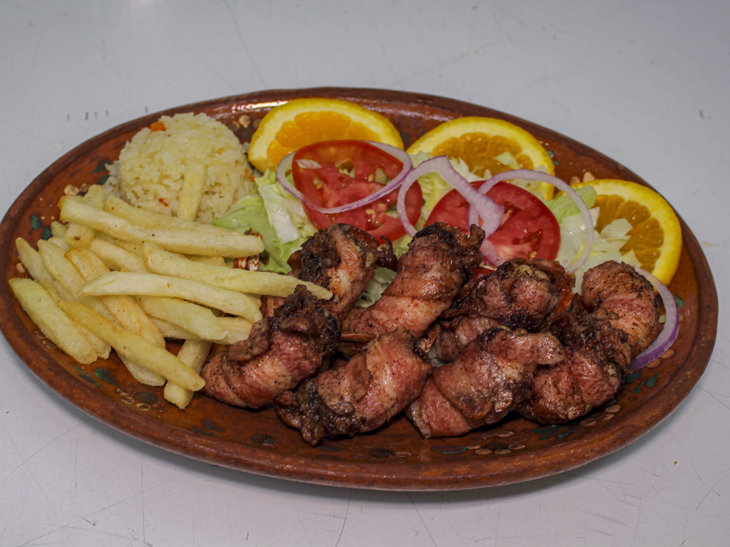 Camarón envuelto en tocino dorado. Acompañado de arroz blanco, papas a la francesa y ensalada.