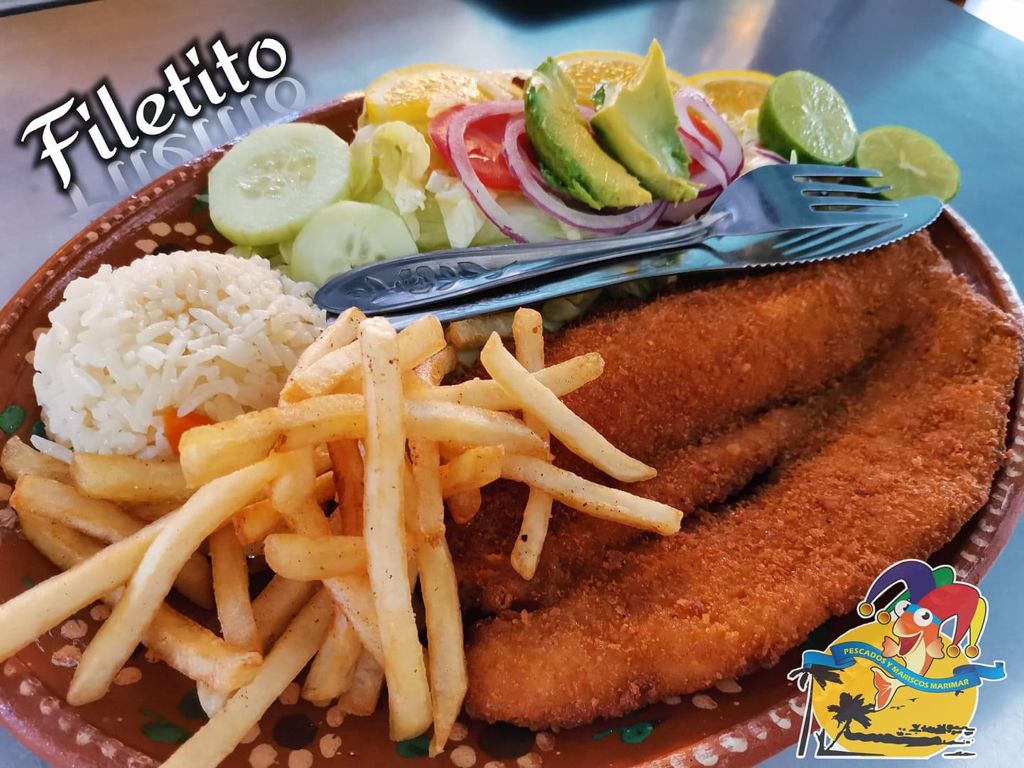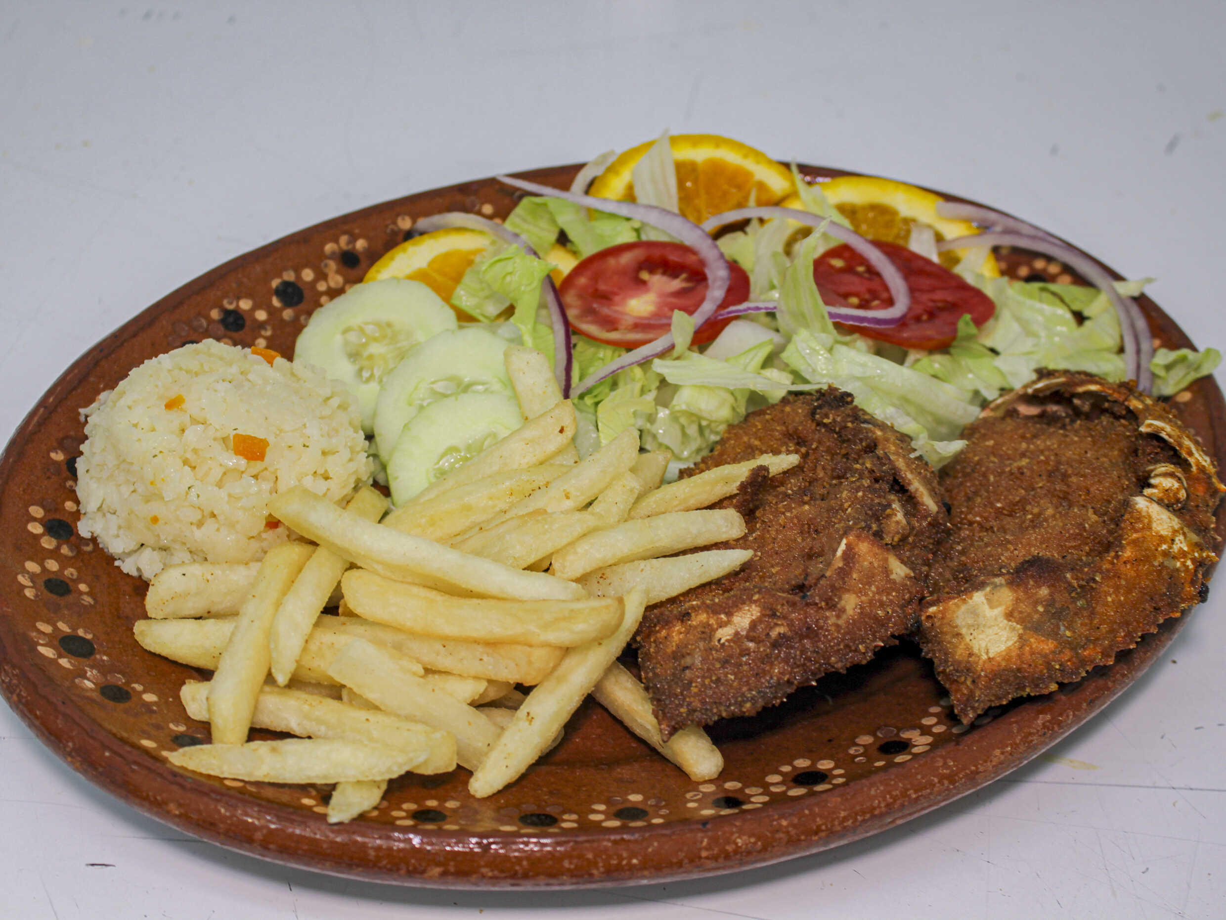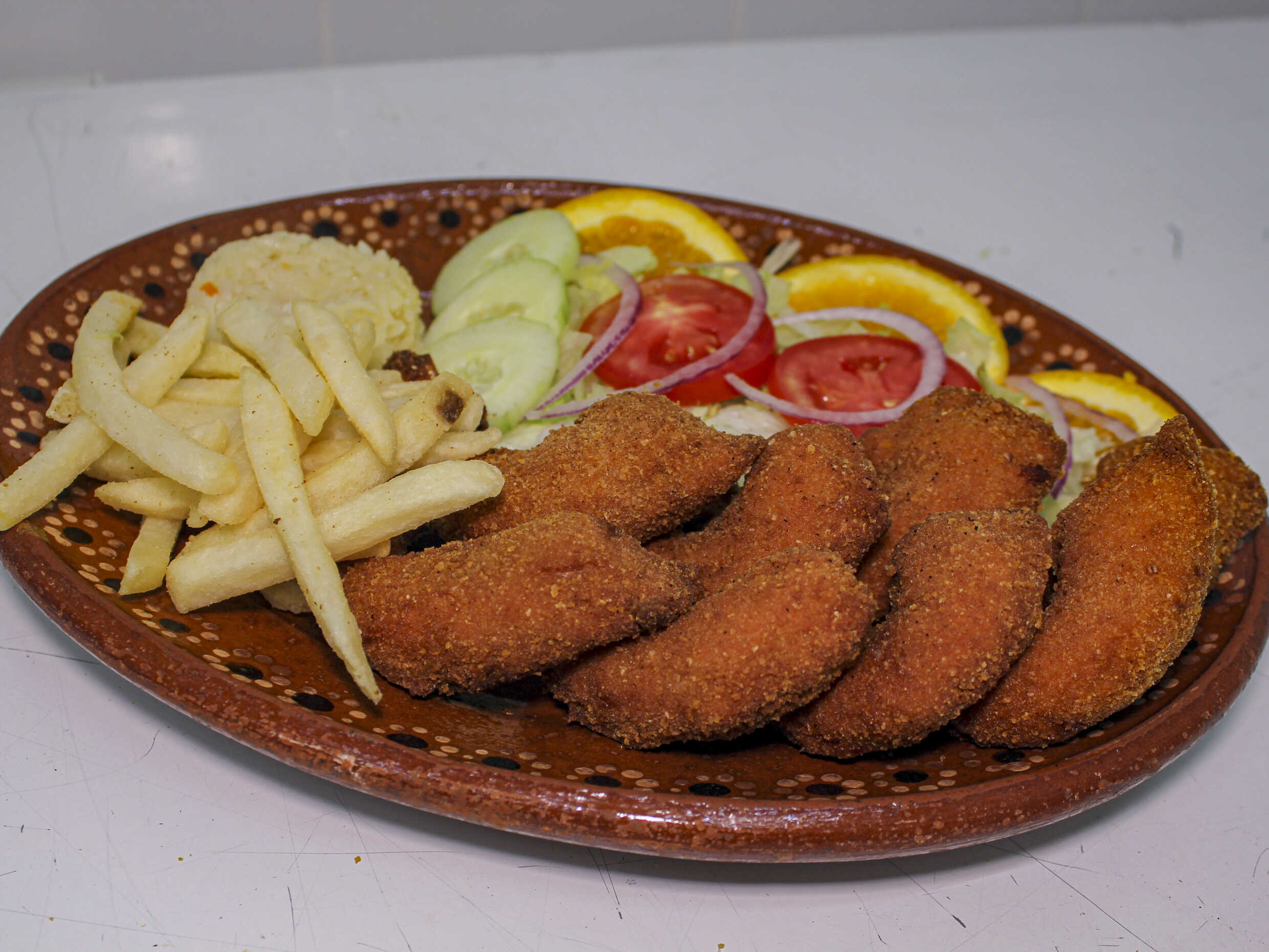 Marinado, empanizado y dorado en aceite. Acompañado de arroz blanco, papas a la francesa y ensalada.