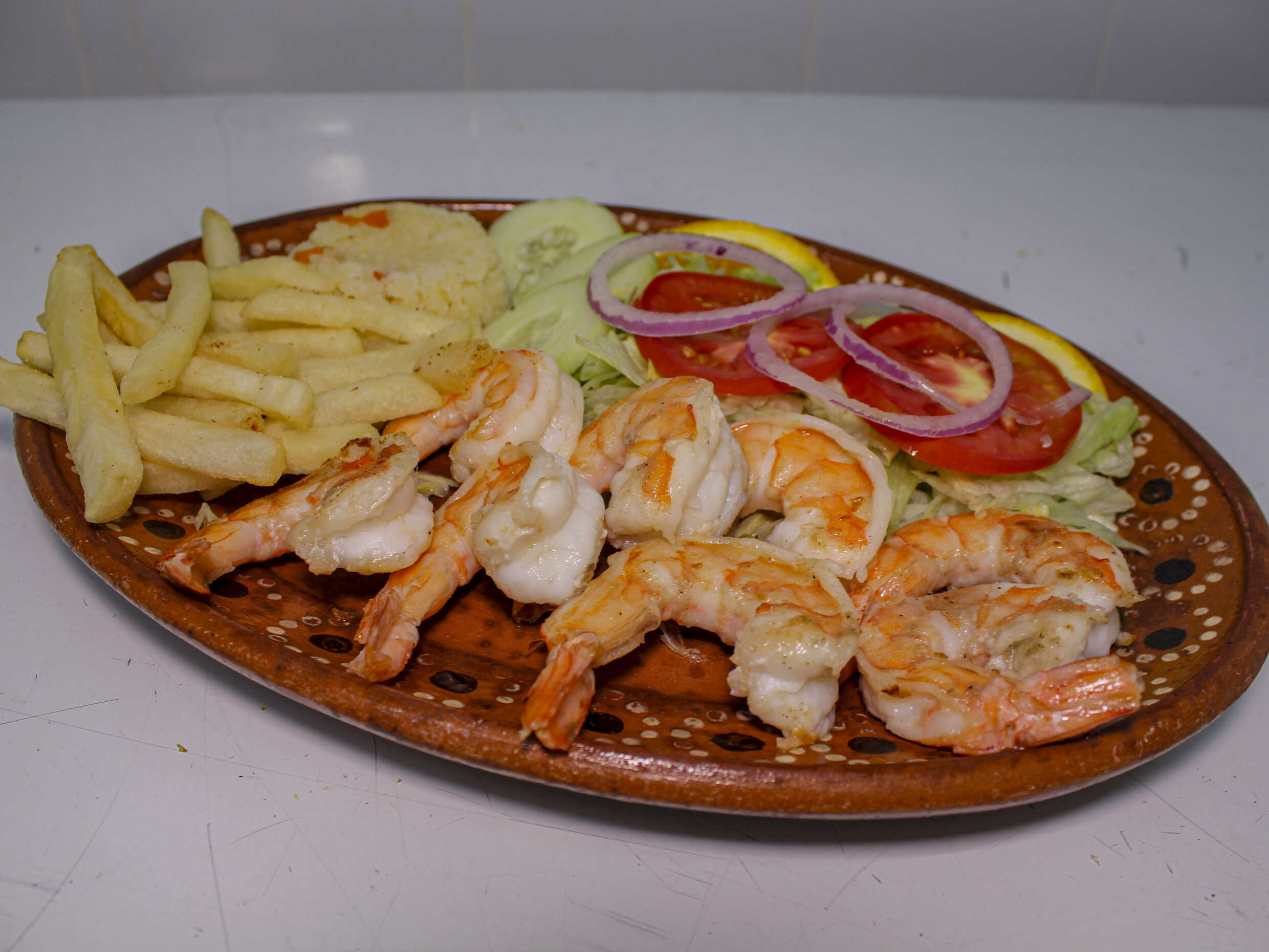 Camarón abierto en mariposa relleno de queso asadero envueltos en tocino. Acompañado de arroz blanco, papas a la francesa y ensalada.