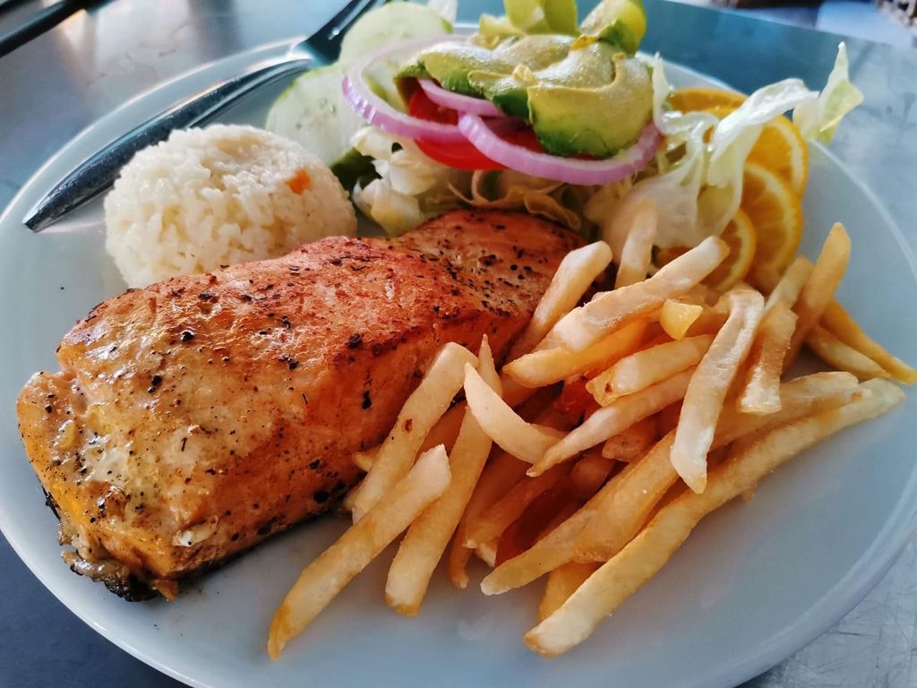 Cocinado solo con mantequilla. Acompañado de arroz blanco, papas a la francesa y ensalada.