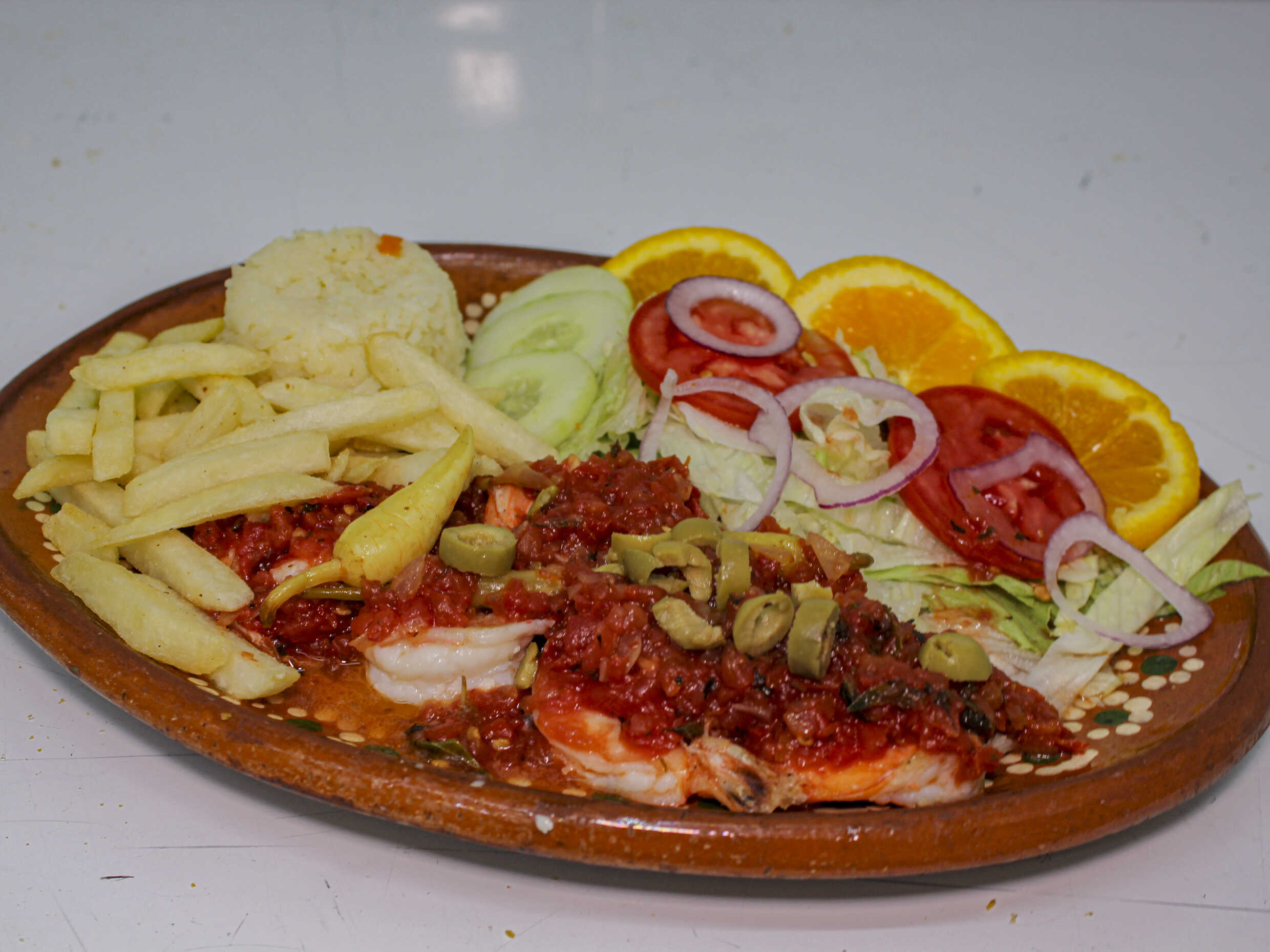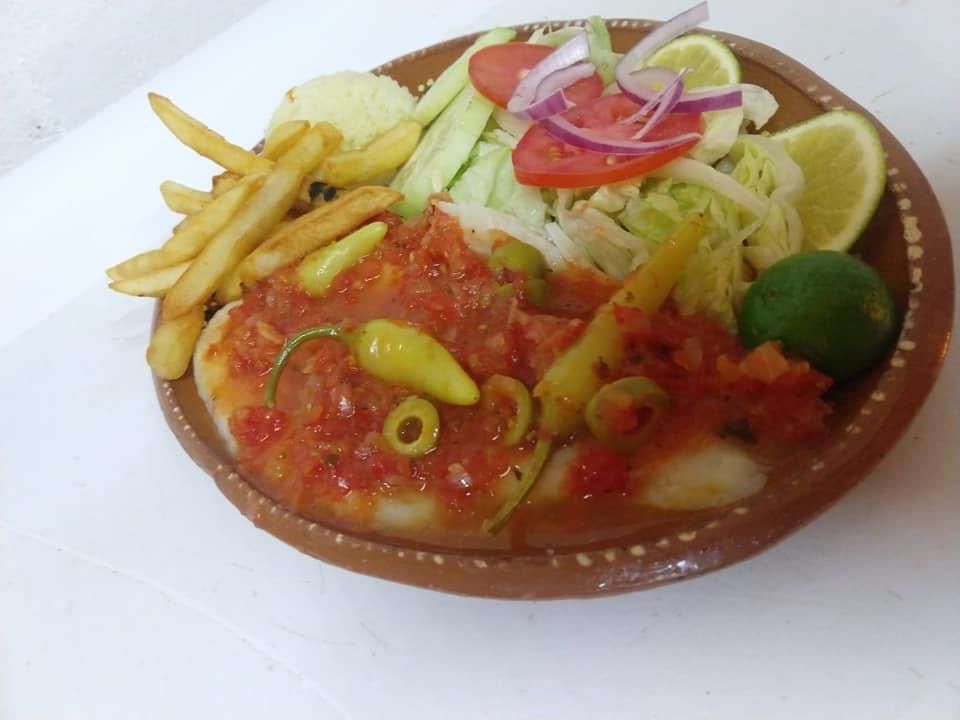 Salsa a base de jitomate, cebolla y chiles güeros machacados sazonados con aceitunas. Acompañado de arroz blanco, papas a la francesa y ensalada.