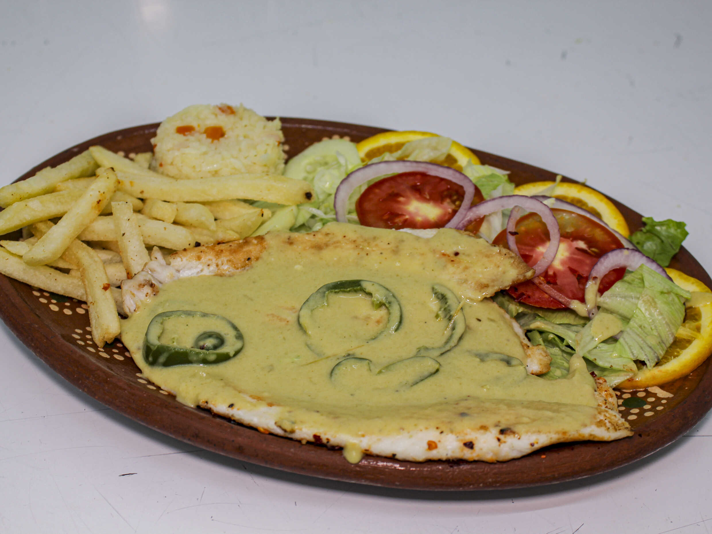 A la plancha bañado en crema de chile jalapeño. Acompañado de arroz blanco, papas a la francesa y ensalada.