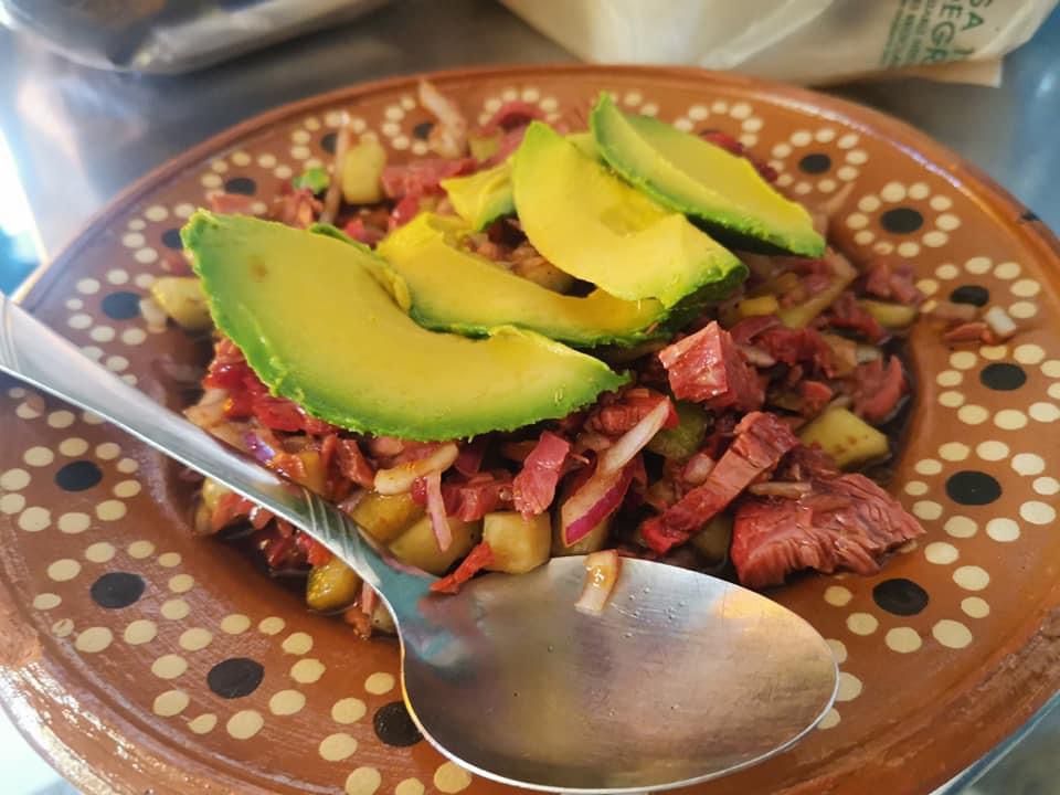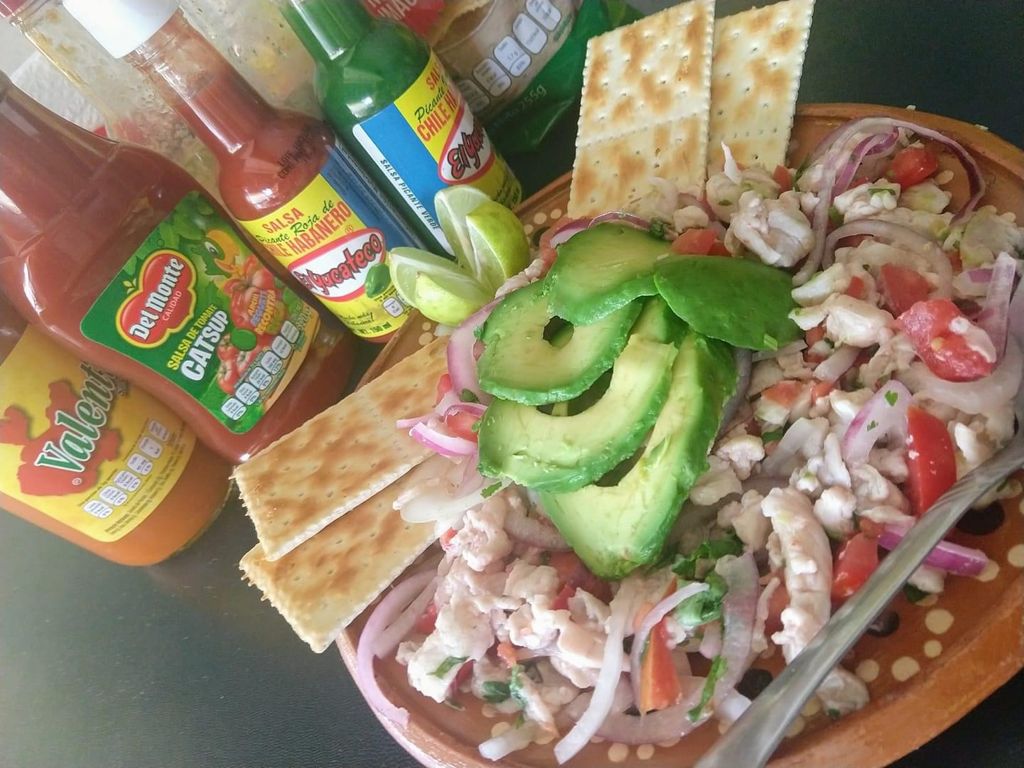 Camarón curtido, pulpo, trozos de pescado, cayo de almeja, pepino, cebolla morada bañada en salsa de la casa.