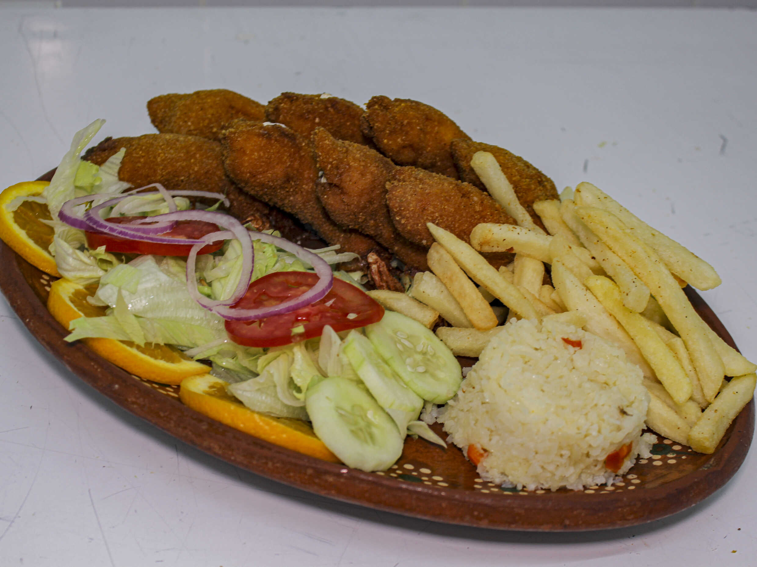 Relleno de camarón y pulpo con queso blanco y amarillo empanizado y dorado en aceite. Acompañado de arroz blanco, papas a la francesa y ensalada.