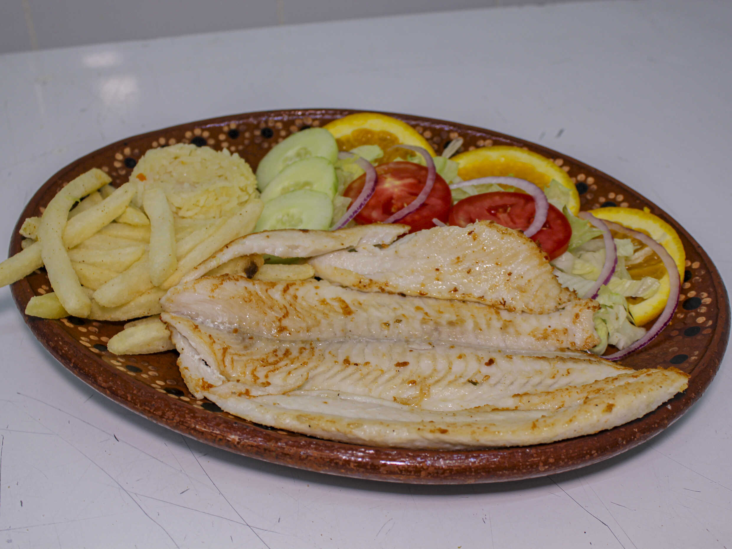 Mojarra dorada acompañada de arroz blanco, papas a la francesa y ensalada.
