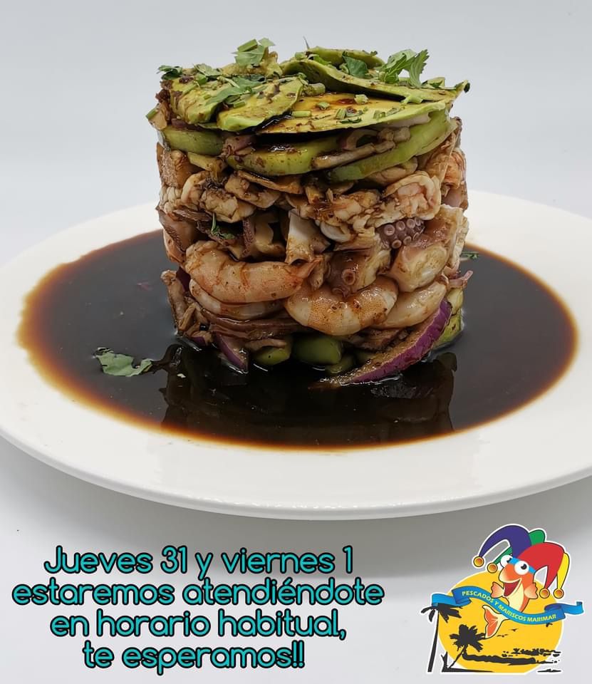 Camarón y pulpo, jitomate, cebolla, aguacate.