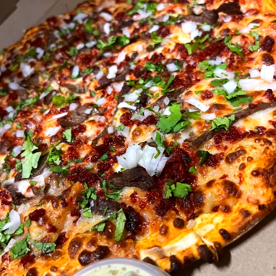 Pizza (38cm) Arrachera, chorizo, cilantro y cebolla frescos en masa delgada y crujiente