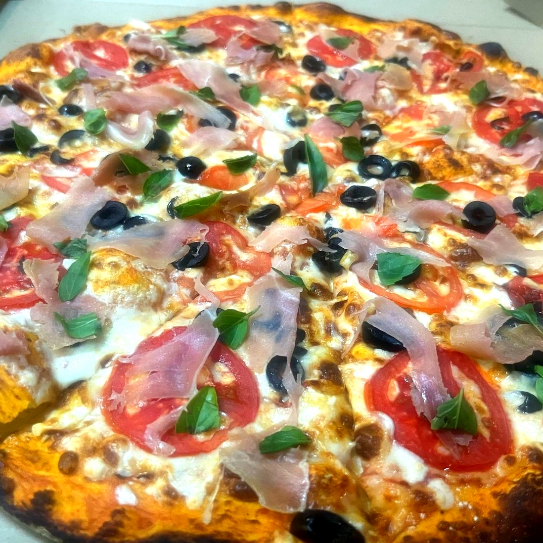 Pizza (38cm) Jitomate rebanado, aceitunas negras, jamon serrano y albahaca fresca en masa delgada y crujiente