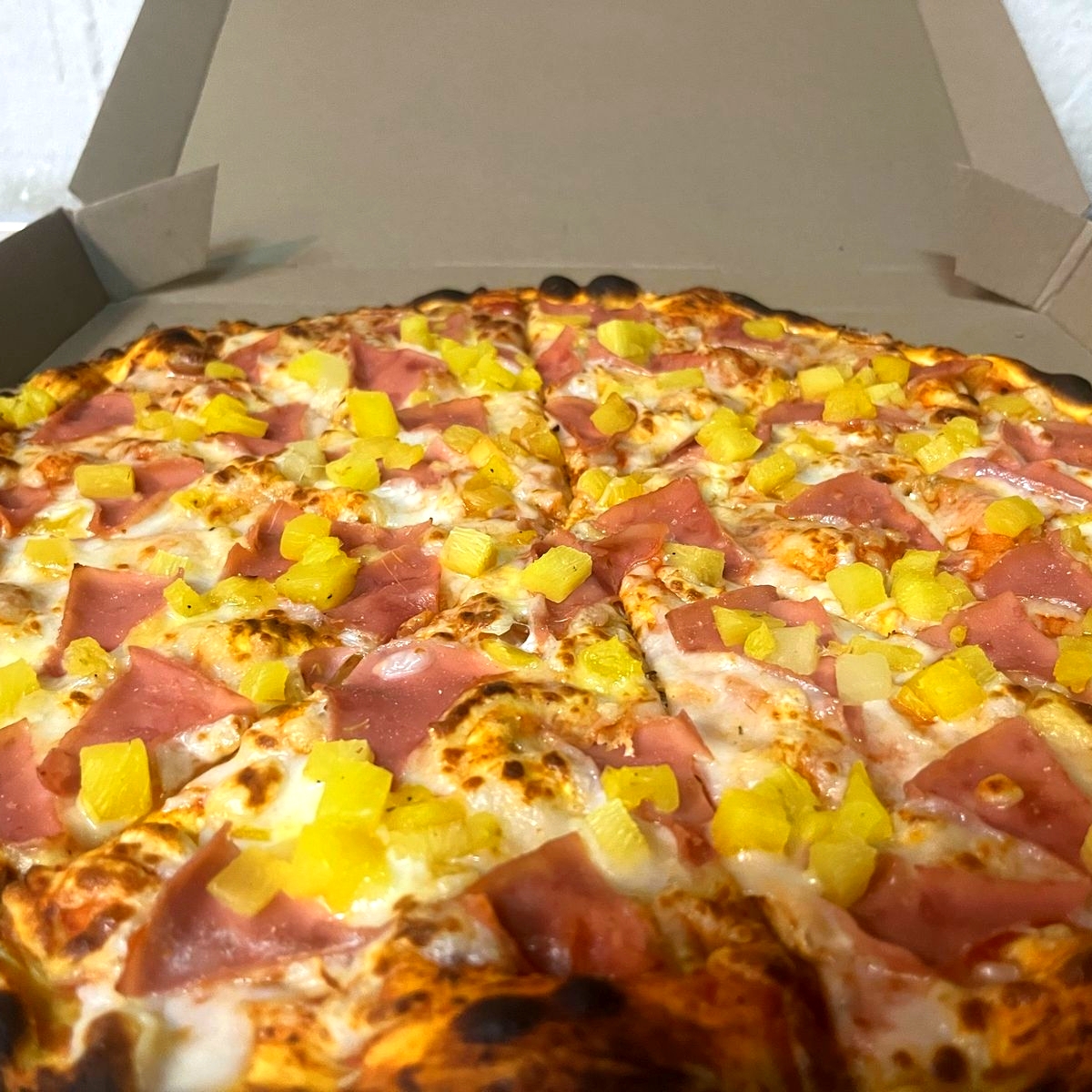 Pizza grande (38 cm) Jamón, piña y mozzarella en masa delgada y crujiente.