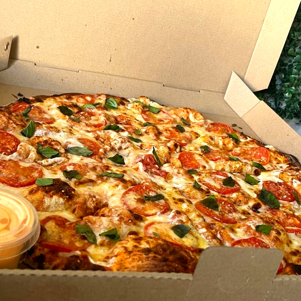 Pizza (38cm) Rodajas de jitomate, espolvoreada con parmesano, aceite de oliva y albahaca fresca en masa delgada y crujiente