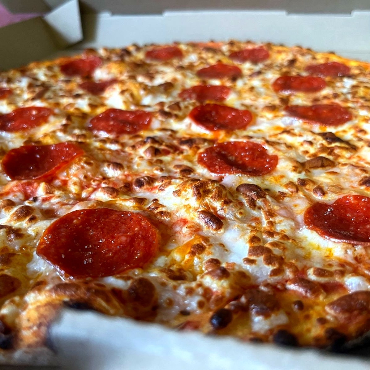 Pizza (38cm) elaborada en horno de piedra Pepperoni y mozzarella en masa delgada y crujiente