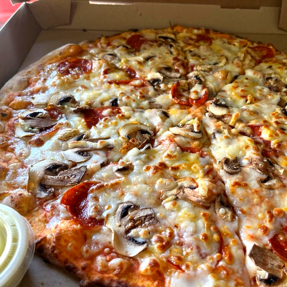 Pizza grande (38cm.) Pepperoni, champiñon y extra mozzarella en masa delgada y crujiente
