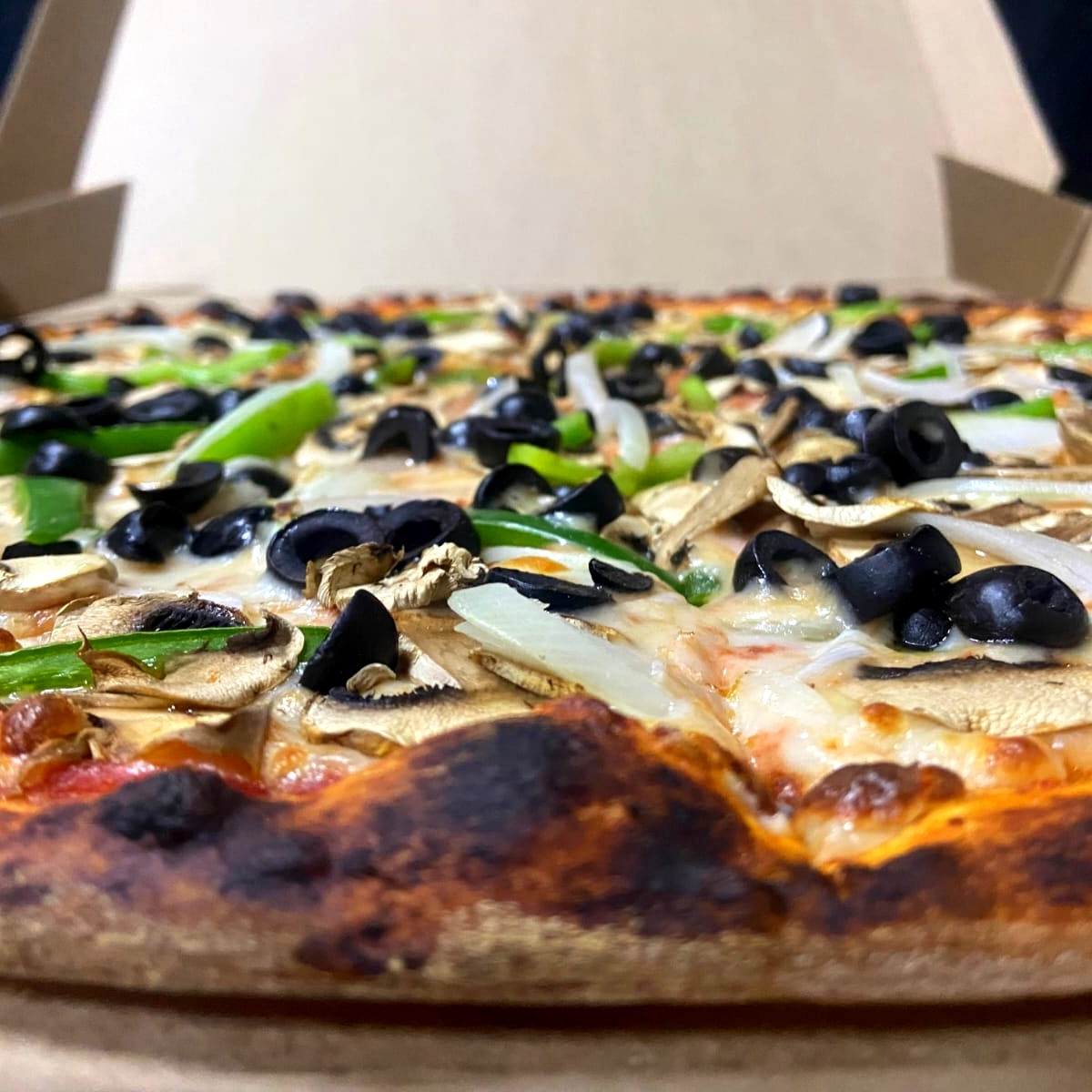 Pizza (38cm) Chapiñones, cebolla, pimiento y aceituna negra en masa delgada y crujiente