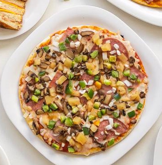 Champiñones , piña,chiledulce,cebolla,granos de elote y doble queso .