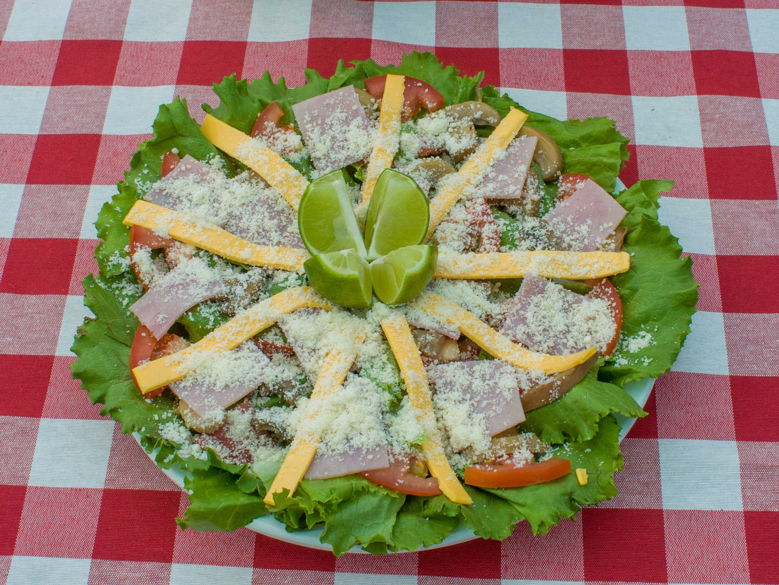 Champiñones , piña ,chile dulce , cebolla y granos de elote .