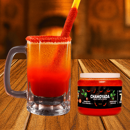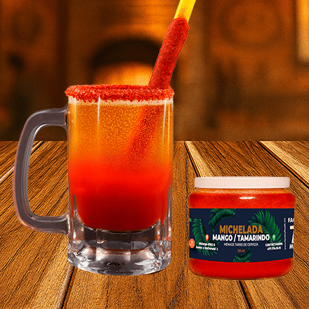 Preparado con sal, jugo de limon, chamoy en polvo, chamoy liquido, pulpa de mango y de tamarindo, popote con tamarindo. No incluye tarro y-cerveza.