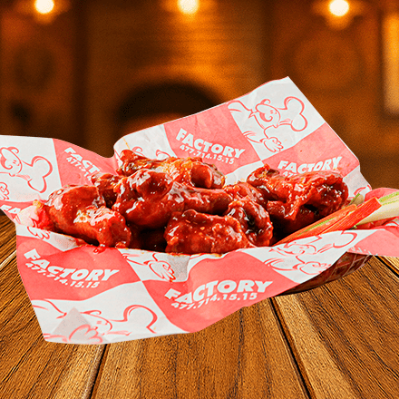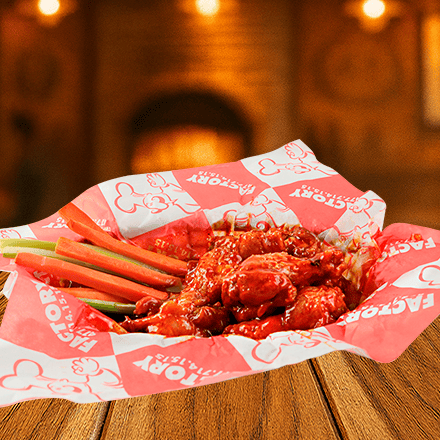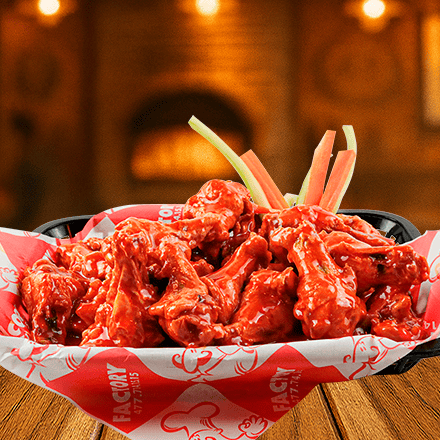 Las auténticas alitas bañadas en la salsa de tú elección con zanahoria y apio.