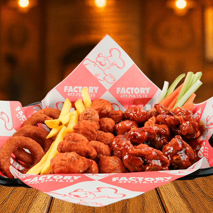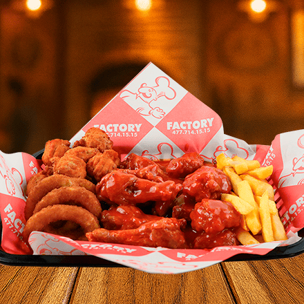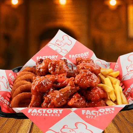 10 pz de alitas, 10 pz de boneless, bañados en tu salsa preferida, con 200 gr de papas a la francesa y 6 aros de cebolla.
