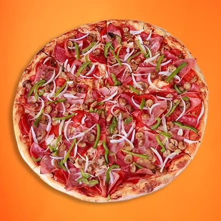 Jamón, morrón, cebolla, champiñones, salami y pepperoni