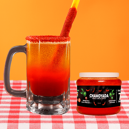 Preparado con sal, jugo de limon, chamoy en polvo, chamoy liquido, pulpa de mango y de tamarindo, popote con tamarindo. No incluye tarro y-cerveza.